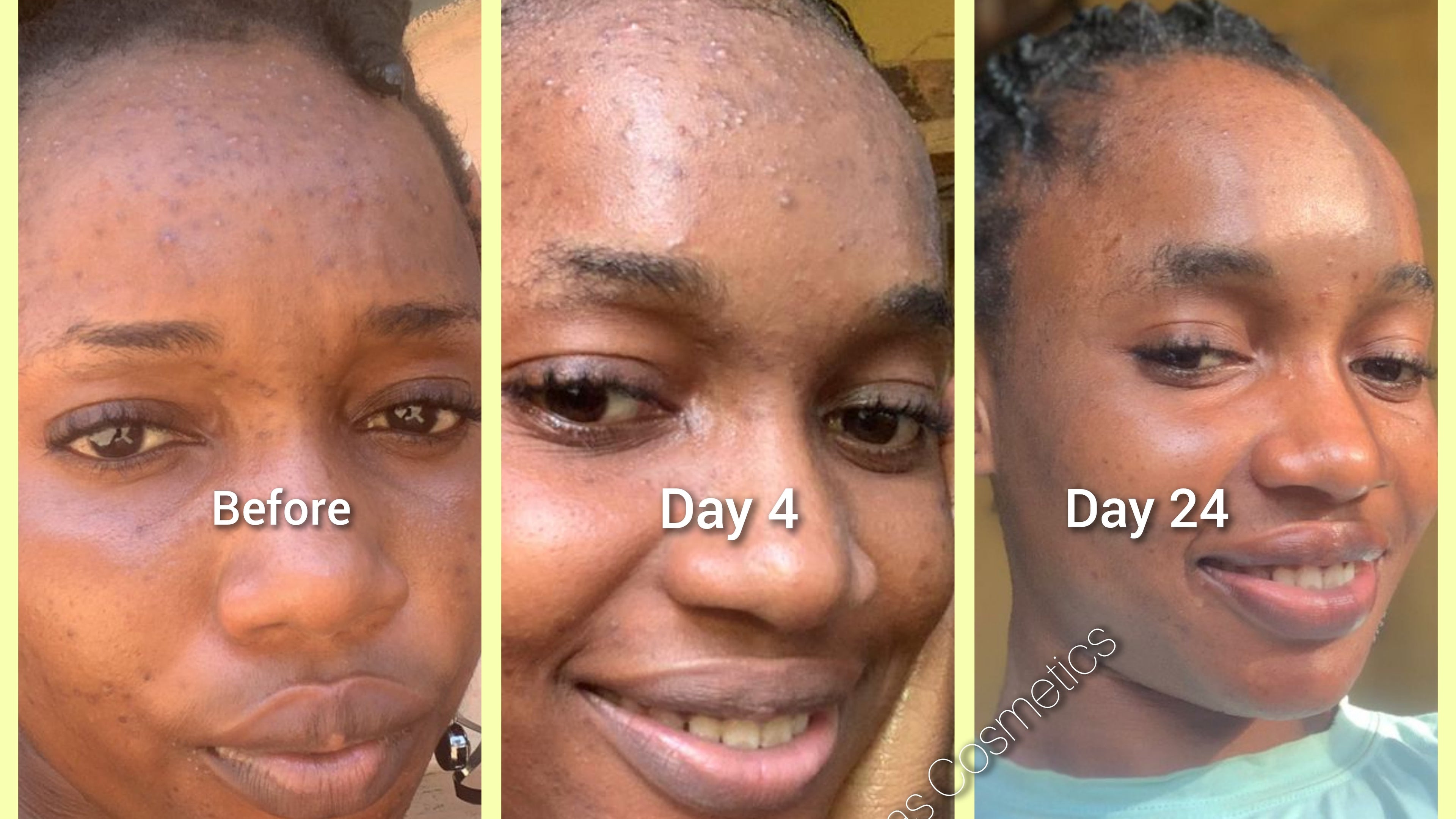 Cassandra lives in Nigeria, she got our products to treat her acne. And in just 23days, her face was cleared of the severe breakouts. And up till date, she's enjoying her skin freedom!