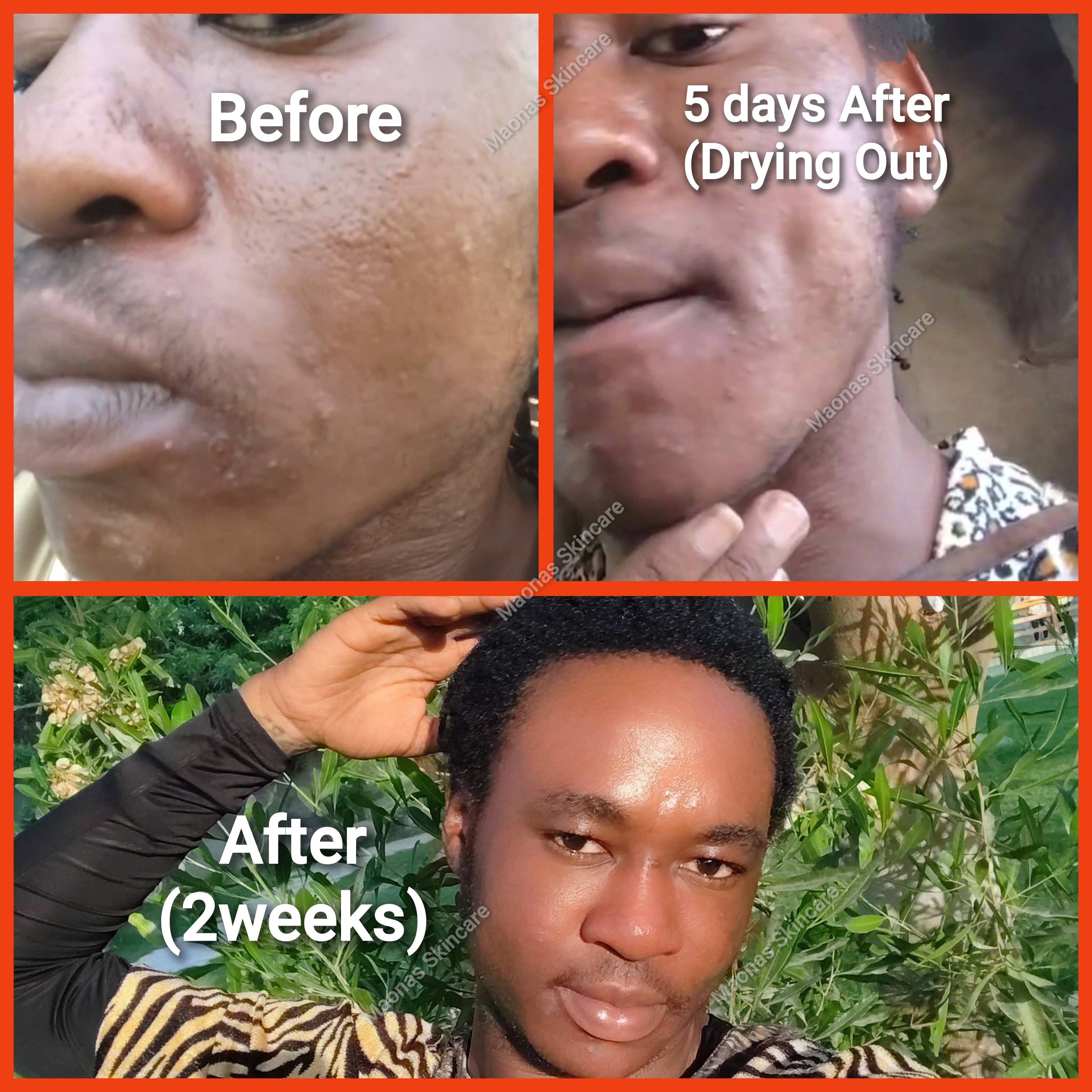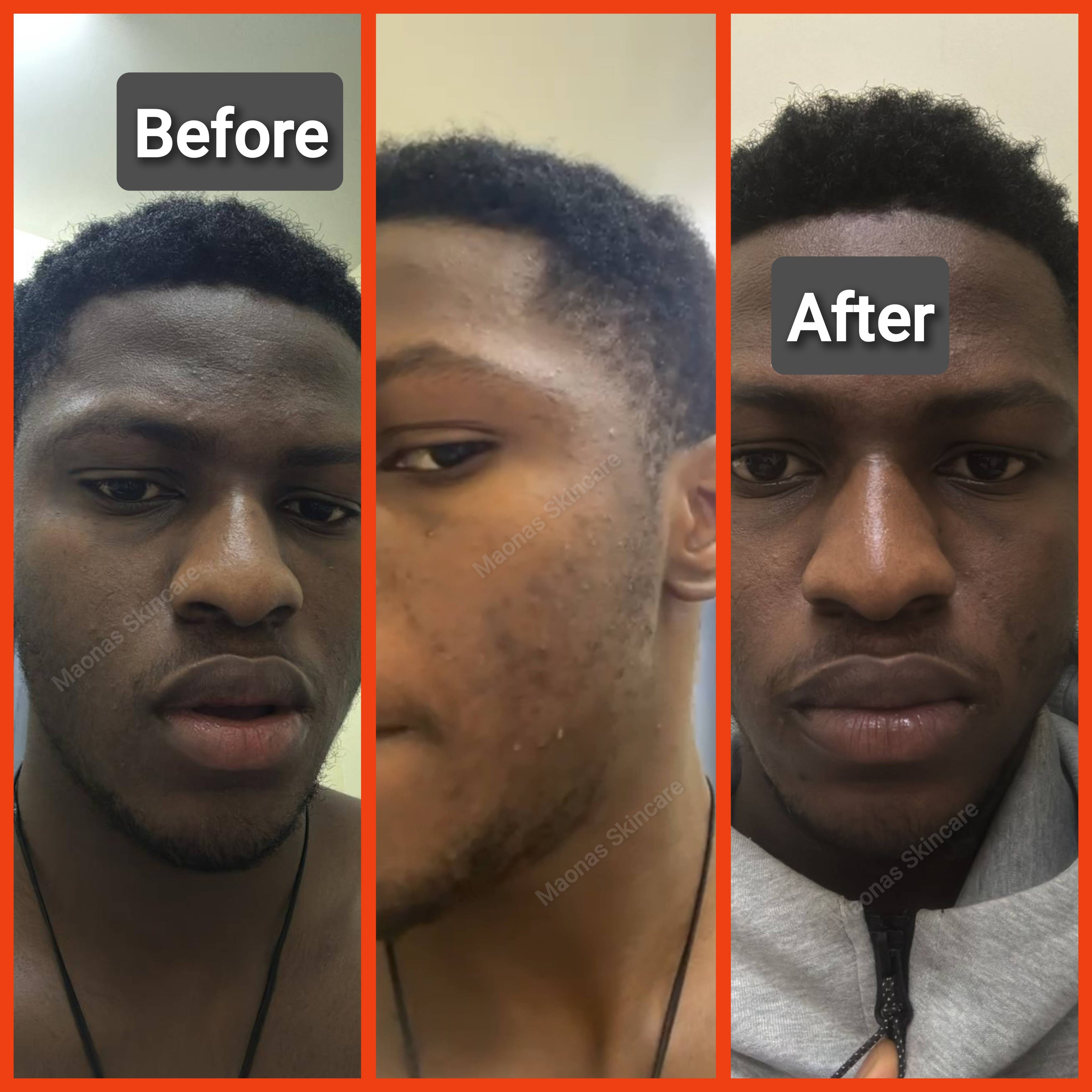 He got his Acne cleared in 2weeks using our Acne Treatment Set, and today he cling to Maonas Skincare with so much trust and satisfaction.